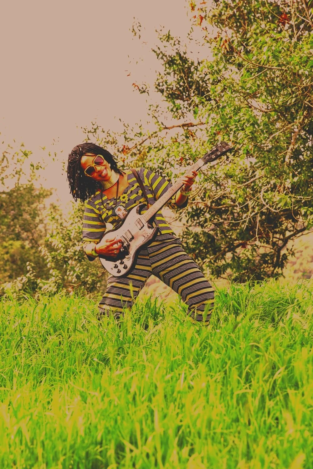 The music draws from West African devotional traditions and electric psychedelic rock. Guitars, horns, and deep rhythmic grooves carry the sound forward.